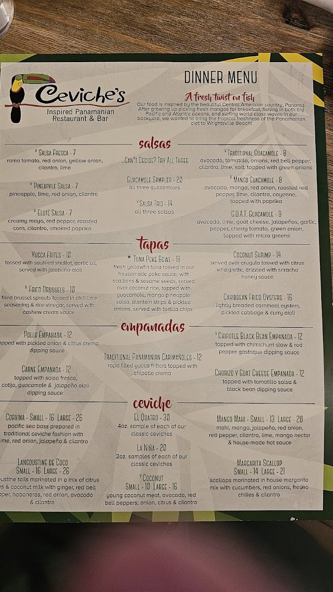 Nestled in Wilmington, NC, Ceviche's is a culinary gem that specializes in vibrant seafood dishes, particularly ceviche. With rave reviews highlighting the impeccable quality of their offerings, you’ll find yourself captivated by their extensive menu. Patrons frequently recommend the scallops and pork, both praised for their perfect cooking and delightful flavor profiles. The ceviche sampler is a must-try, showcasing the restaurant's commitment to freshness and creativity.